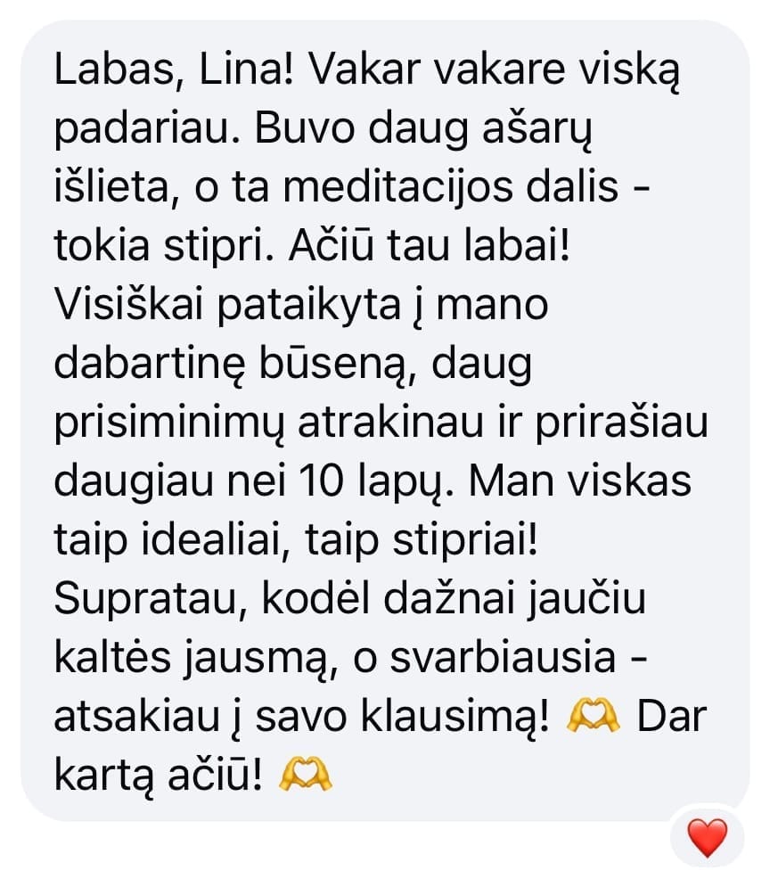 Hi Lina! I went through everything last night, and I cried so many tears. The meditation part was incredibly powerful. Thank you so much! It completely resonated with my current state. I unlocked so many memories and ended up writing over 10 pages. Everything felt so perfect and so intense! I finally understood why I often feel guilt, and most importantly, I answered my question! 🫶 Thank you again! 🫶